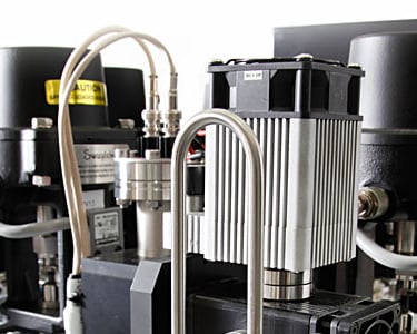 Up to 25 mineral samples can be loaded into the laser chamber of the Alphachron and heated (approximately 1000°C for apatite, and approximately 1250°C for zircon) under vacuum for five to fifteen minutes with a 980 nm diode laser. The extracted gas samples are analyzed to determine their radiogenic helium-4 content. The gas extraction process is repeated to ensure all the gas has been removed from the sample. Parent mineral concentration is subsequently determined by ICP-MS analysis of the sample.