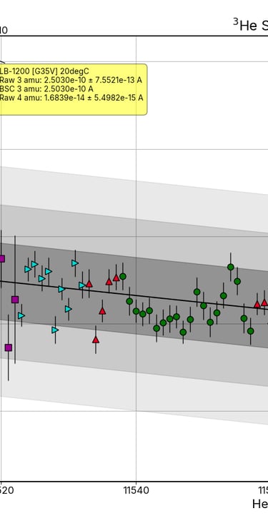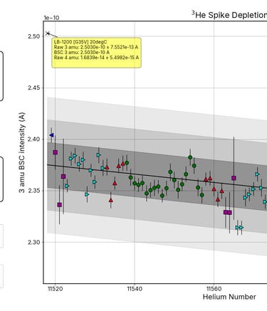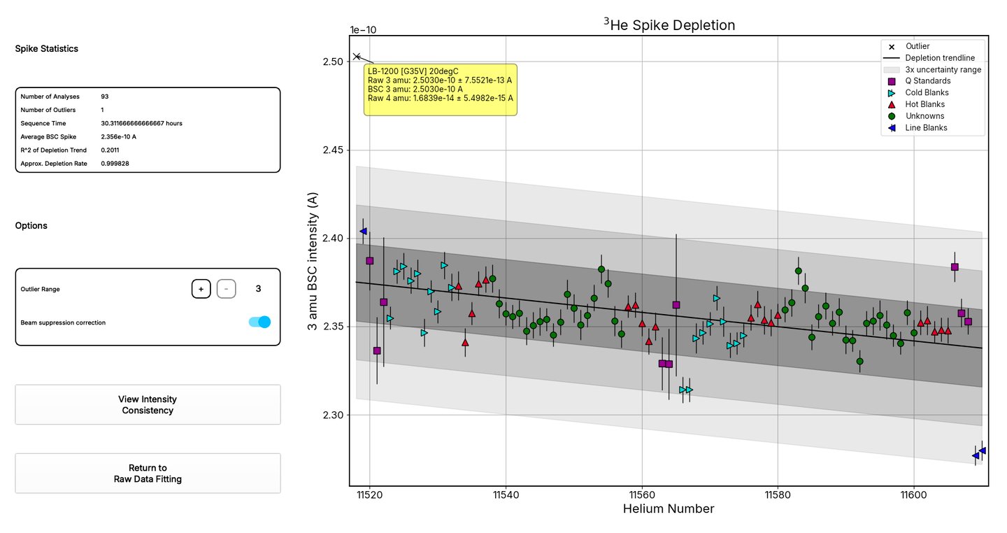 Spike Depletion: Based on a rough helium-4 beam suppression correction, this technique identifies outliers by identifying helium-3 spike intensities which fail to conform to the overall depletion trend throughout the sequence.